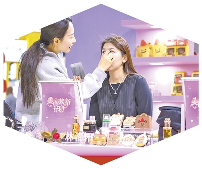 在上海举办的中国美容博览会上,客商亲身体验化妆。